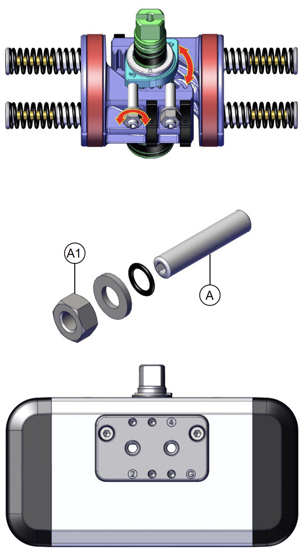 单效版本中,无供应压力时轴逆时针旋转,执行器自动返回至待命位置,末端位置如图所示。建议在孔位4上安装一个小型滤芯,避免灰尘或固体颗粒进入缸筒内影响气体流通。