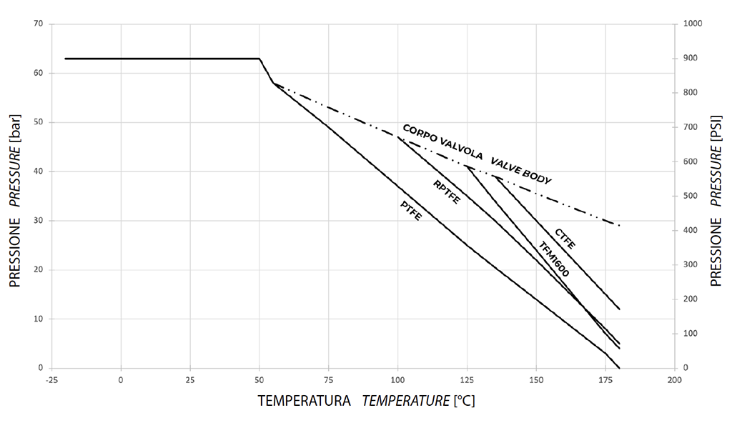 ALLGEMEINE EIGENSCHAFTEN: • Ausführung in 3 Teilen für Anlagen, die häufiger Wartungsarbeiten bedürfen. • Enden: mit Innengewinde gemäß der Norm ISO 7/1; Muffen- und Stumpfschweißen; NPT (ANSI B1.20.1). • Standarddichtungen der Kugel aus nicht verstärktem PTFE. • Betriebstemperatur: -20°C bis +180°C (siehe Diagramm) • Betriebsdruck: siehe Diagramm. • Betriebsmedien: Luft, Wasser, Gas, Erdölprodukte und Petrochemikalien sowie aggressive Medien. • Montageflansch für Stellantrieb gemäß ISO 5211 • Bei Ausführung mit Handhebel: integrierte Verriegelungsvorrichtung. SONDERAUSFÜHRUNGEN AUF ANFRAGE: • Dichtungen aus: • RPTFE (15% glasfaserverstärkt) • PTFE (25% graphitverstärkt) • TFM1600. • Für andere Anwendungen wenden Sie sich an unsere Verkaufsabteilung. ZERTIFIZIERUNGEN: • ATEX-Ausführung gemäß der EU-Richtlinie 2014/34/EU (ATEX) • ATEX-Zertifikat auf Anfrage • In Einklang mit der EU-Richtlinie 2014/68/EU PED