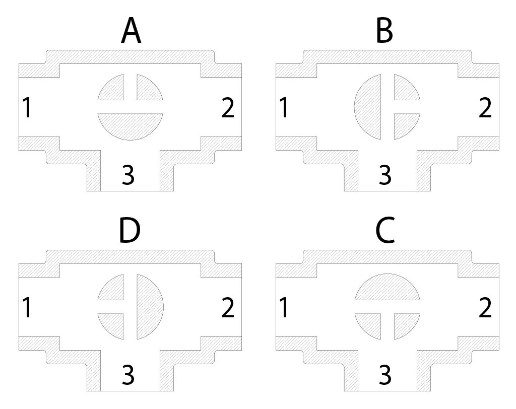 Mit Antrieb sind nur zwei Positionen mit 90°-Drehung möglich: Die Konfiguration der Kugel muss unserer Verkaufsabteilung stets mitgeteilt werden. HINWEIS: Bei NORMAL GESCHLOSSENEM SR-Stellantrieb die Ruhestellung der Kugel wählen; bei Betrieb dreht sich der Antrieb gegen den Uhrzeigersinn. Bei NORMAL GEÖFFNETEM SR-Stellantrieb die Ruhestellung der Kugel wählen; bei Betrieb dreht sich der Antrieb in den Uhrzeigersinn.