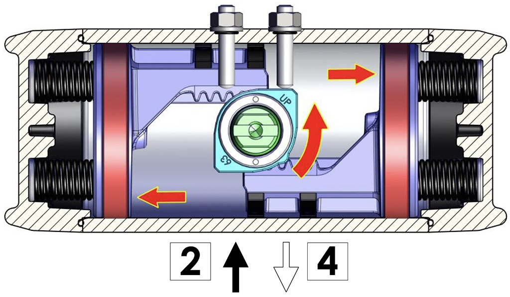 Durch Einleiten von Luft in die Versorgungsöffnung 2 bewegen sich die Kolben zur Außenseite und drücken auf die Federn. Es erfolgt eine Drehung der Welle im Uhrzeigersinn. In der Zeichnung wird die Endposition dargestellt.