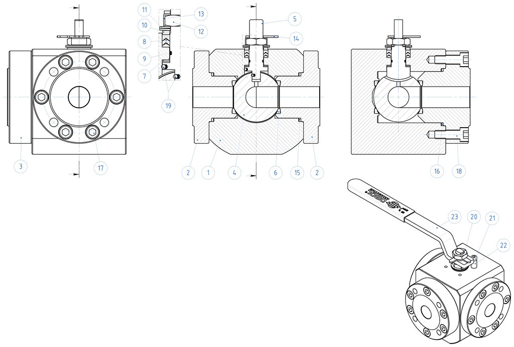 EXECUTION ON REQUEST • For other flanges type please contact our sales department. • Sealing in: PTFE reinforced with glass (PTFE-GF), PTFE reinforced with carbongraphite (PTFE-CF). For other types of materials please contact our sales department. • Stainless steel lever • Stainless steel stem nuts and springs • For versions with materials (body/ball/stem) different from the standard please contact our sales department • ATEX marking and certificate ON REQUEST CERTIFICATIONS • In compliance with European Directive 2014/68/EU PED; Fugitive Emission ISO 15848 (ISO FE BH-C03-SSA 0); Ta-Luft VDI: 2440 • Safety integrity level up to SIL3 according to the IEC 61508 • In compliance with ATEX 2014/34/EU Directive , ATEX certificate ON REQUEST. ENGINEERING STANDARD • Body thickness in compliance with: ASME B16.34, ASME VIII div.1, EN12516 • Materials and rating in compliance with ASME B16.34 for ANSI valves and EN12516 for PN valves.