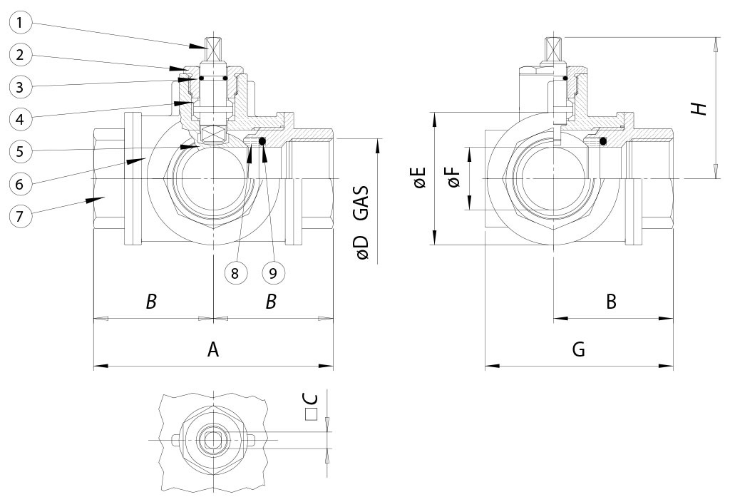 GENERAL FEATURES: • Valve with 4 ball seats. Inlet from any of the 3 ends, see plane • Working temperature: from -15°C to + 120°C • Working pressure: see table. • Fluid range: water, air, gas, vacuum, petroleum and petrochemical products. Not suitable for aggressive media. • Threaded ends as per ISO 7/1 specifications.