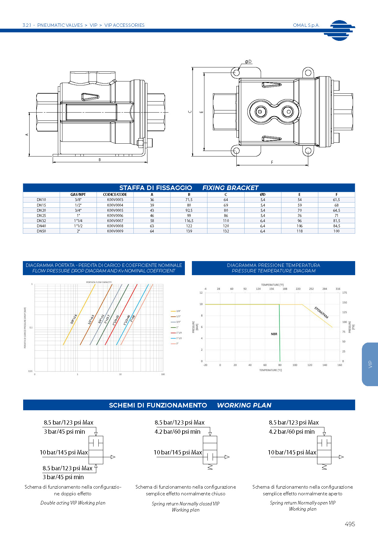 GENERAL FEATURES: • Both Double Acting and Spring Return VIP valves (either Normally Open or Normally Closed) are available in sizes ranging from 3/8” to 2”. • Unidirectional flow. • GAS threaded ends as per EN 10226-1 Rp (ISO 7/1) - DIN 2999 (NPT threads on request) with control fluid connections as per NAMUR interface (optional). • Improved fluid dynamics allow minimum pressure losses. See Flow Pressure Diagram. • VIP valves can be used in any mounting position (horizontal, vertical or oblique). • They can be provided with seals in NBR, FKM or EPDM: - NBR: suitable for air, gaseous fluids, oils, water etc. - FKM: perfectly suitable for most fluid. Unsuitable for steam. - EPDM: perfectly suitable for hot water. Unsuitable for mineral products (oils, grease, etc.). • Possibility to check open / close valve position thanks to inductive limit switches (magnetic contact) available on request. Internal magnet needs to be requested at VIP order phase. • Leackage rate class VI according to IEC 60534-4 (ANSI-FCI 70-2 class VI). • According to 2014/68/EU “PED”. • 2014/34/EU ATEX configuration to request at time of order.