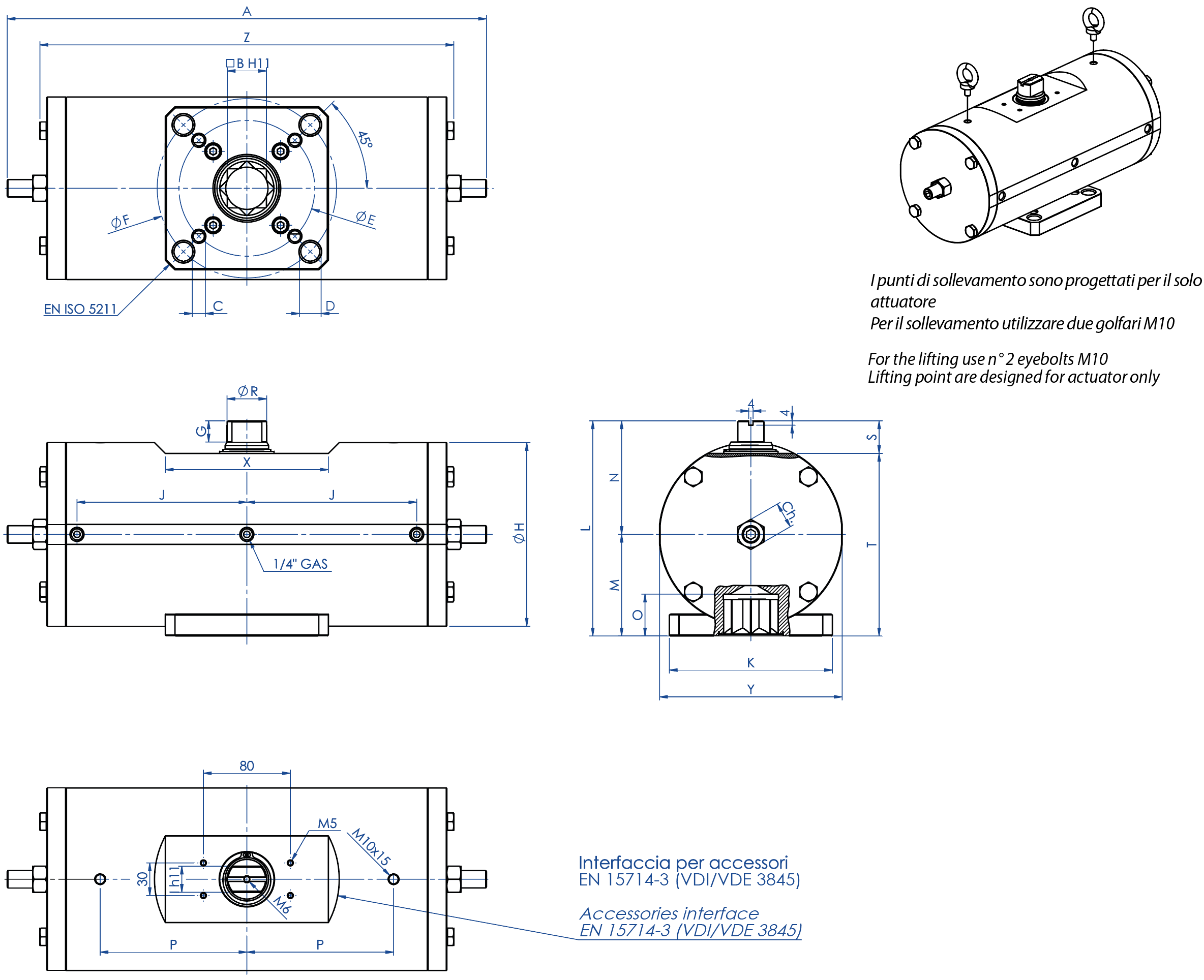DATOS TÉCNICOS Par desde 720 Nm a 1920 Nm. Brida de conexión: EN ISO 5211 F10 - F12 - F14 - F16. Cumple con EN 15714-3. Ángulo de rotación: 92° (-1°, +91°) Momento de torsión: Directamente proporcional a la presión de alimentación; ver tabla actuadores neumáticos DA. En cada actuador la cifra que sigue a la sigla DA corresponde al valor del par de aceleración en Nm. a la presión de 5,6 bar. Actuadores con pintura epoxídica Versión ATEX de conformidad con la directiva 2014/34/UE. Para la versión ATEX añadir YX al final del código.