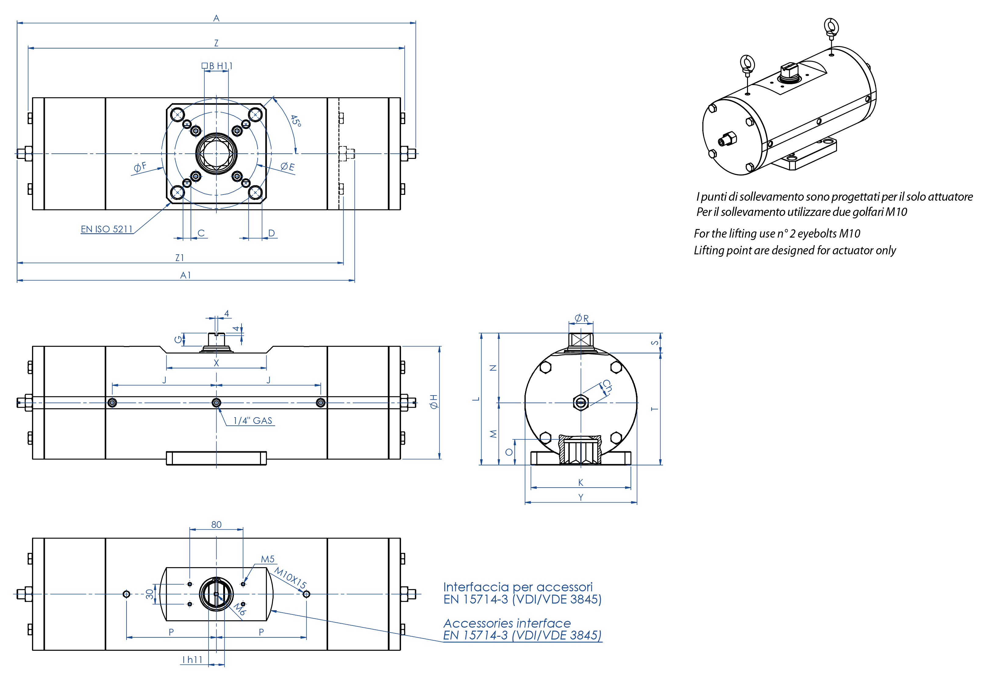 DATOS TÉCNICOS Par desde 360 Nm a 960 Nm. Brida de conexión: EN ISO 5211; F10 - F12 - F14 - F16. Conforme a la EN 15714-3 Ángulo de rotación: 92° (-1°, +91°) Momento de torsión: el momento de torsión de retorno depende solo de la acción del muelle y es independiente de la presión de alimentación.