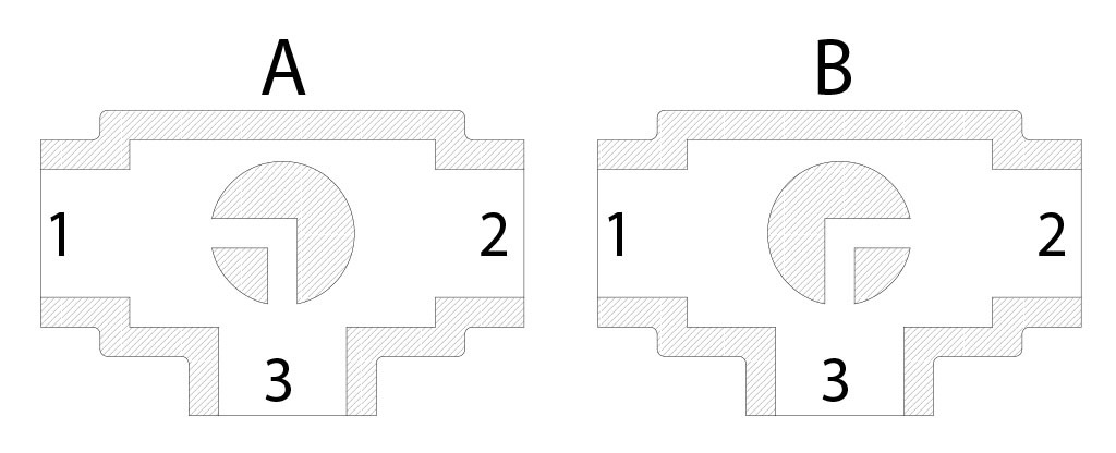 Con el actuador son posibles solo dos posiciones con rotación de 90°: la configuración de la bola siempre debe comunicarse a nuestro departamento comercial. N.B.: Con el actuador SR NORMALMENTE CERRADO elegir la posición de reposo de la bola; alimentando, el actuador gira en sentido contrario a las agujas del reloj. Con el actuador SR NORMALMENTE ABIERTO elegir la posición de reposo de la bola; alimentando, el actuador gira en sentido de las agujas del reloj.