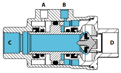 Principio de funcionamiento La válvula de interceptación neumática VIP (patente exclusiva de OMAL) es, en todos los aspectos, una válvula automática que integra en un único dispositivo tanto el mecanismo de interceptación (entre los conductos C-D) como el mecanismo de control (A-B). El principio de funcionamiento se basa en el movimiento interno de un pistón, debido a la presión del fluido de control. Una vez completado su recorrido (VIP es una válvula on/off), el pistón presiona o se separa de la junta de asiento, para permitir o bloquear el paso del fluido interceptado. Dado que la estanqueidad se realiza sobre el asiento y que las presiones del fluido interceptado se descargan sobre el asiento, la presión necesaria para que el pistón se mueva no depende de la del fluido interceptado. Esto ha permitido reducir el peso y las dimensiones totales, y garantizar un número muy elevado de maniobras de apertura y cierre. La válvula es de paso total, y el estudio preciso de la dinámica interna del fluido hace posible reducir al mínimo las turbulencias y las caídas de presión.