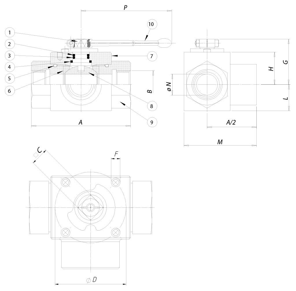 CARACTÉRISTIQUES GÉNÉRALES: • Extrémités filetées femelles selon DIN/ISO 228 • La vanne ne fonctionne que comme un déviateur et ne permet aucune fermeture du débit. • L'entrée doit être connectée au manchon central. • Température de fonctionnement: de -10°C à +100°C • Pressions de fonctionnement: 3/8”-1/2” PN 500; 3/4”-1” PN 315. • Fluide véhiculé: huiles, produits pétroliers et produits pétrochimiques.