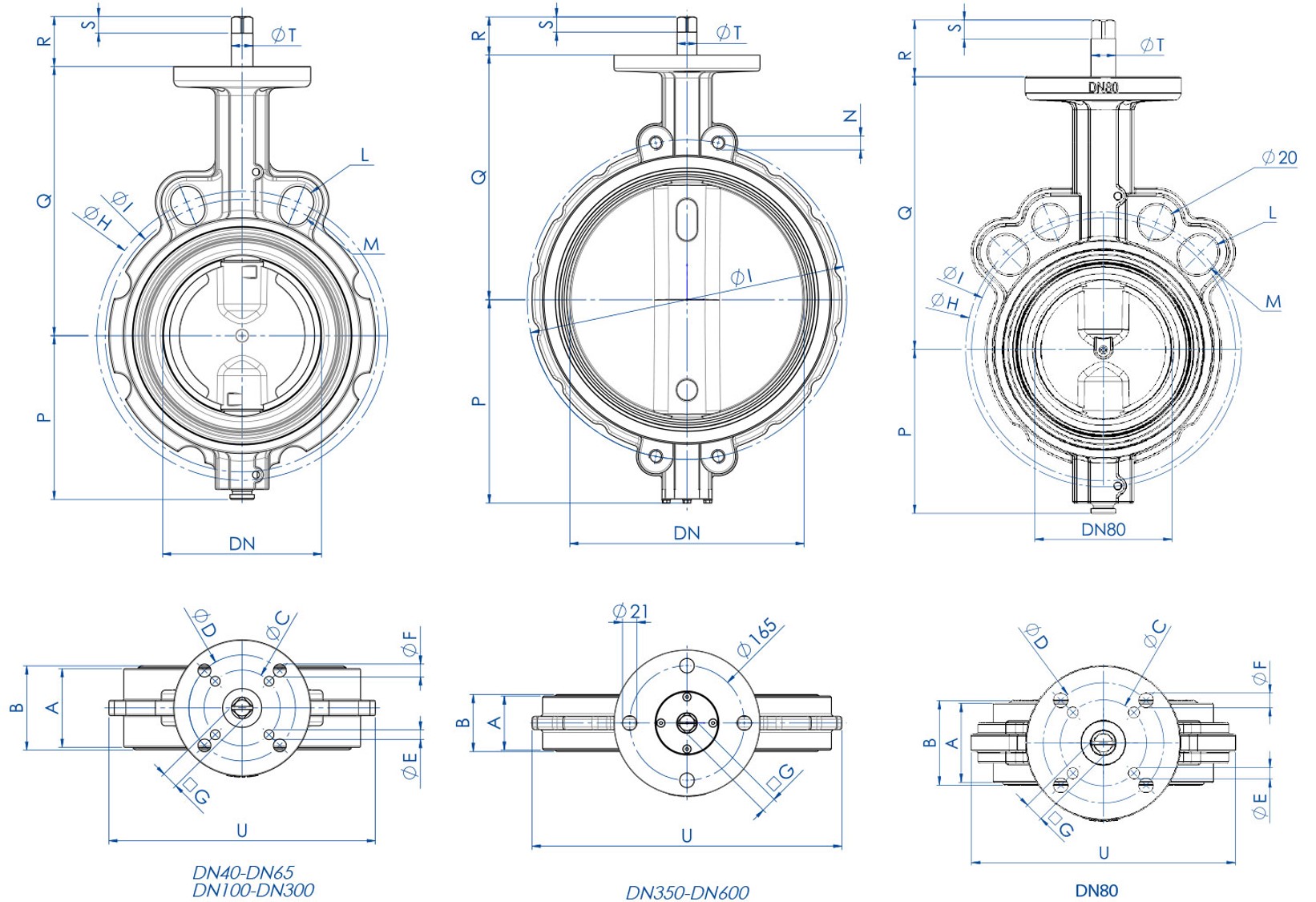 | DN 400 | 16" | 421 | 102 | 48 | 220 | 300 | 258 | 105 | 75 | 461 | 325 | 301 | 95 |