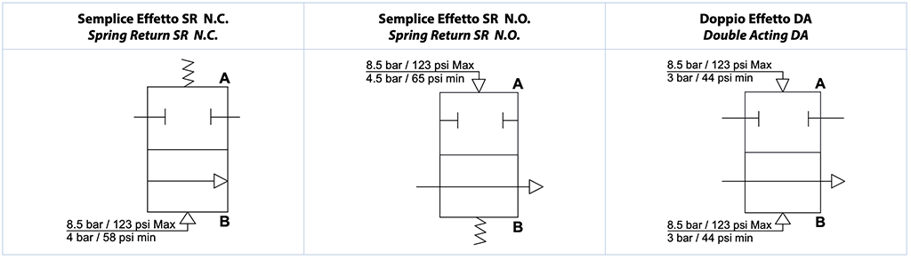 - Simple effet N.O. : min. 4,5 bar (65 psi) ; max. 8,5 bar (123 psi).