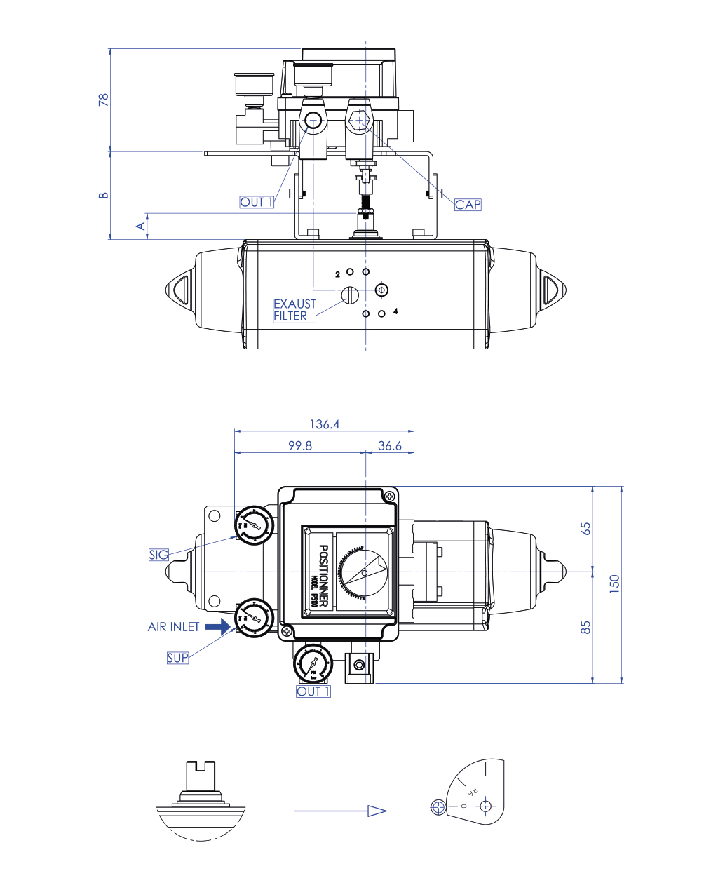 DESCRIZIONE Il posizionatore pneumatico a camma è particolarmente adatto per l’azionamento proporzionale di attuatori sia DA che SR. Il posizionatore è collegato all’attuatore tramite una staffa che viene bloccata sulla foratura dell’attuatore. Un segnale regolante pneumatico, dato da: termostato, viscosimetro, pressostato,ecc. viene inviato al posizionatore che in base al valore di tale segnale regola l’angolo di apertura o di chiusura della valvola. L’azione oraria o antioraria può essere modificata senza utilizzare parti addizionali, basta rovesciare la camma interna e invertire i collegamenti verso l’attuatore.