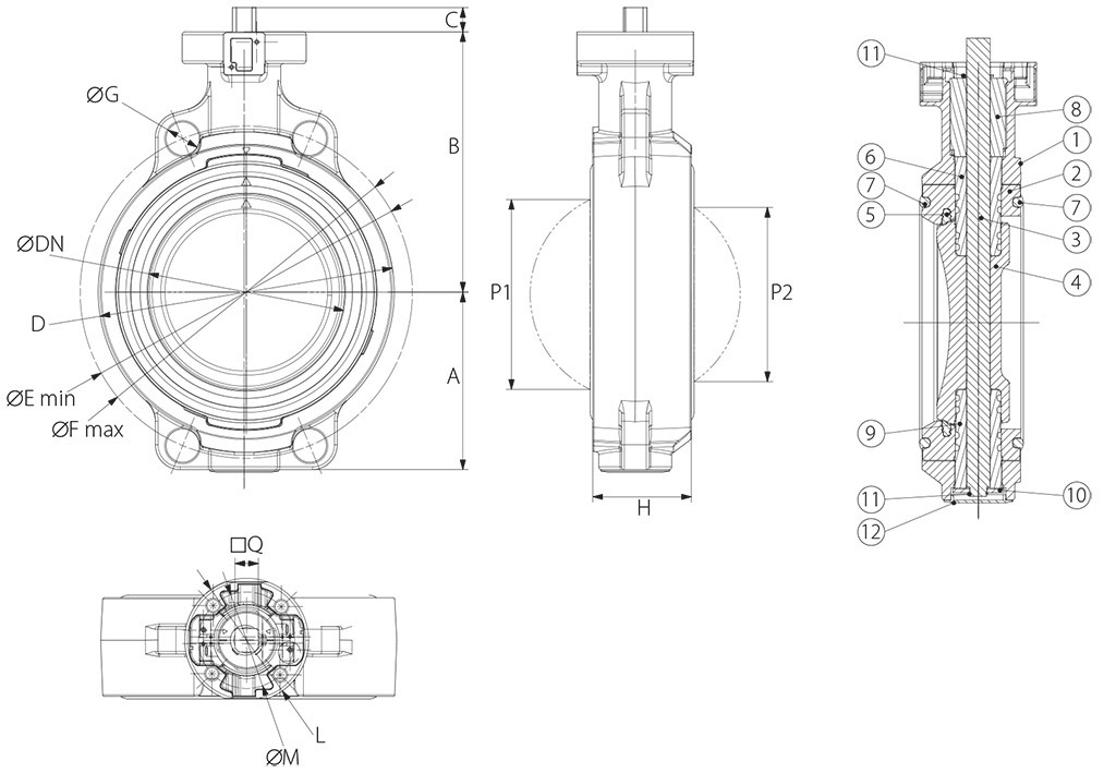 ESECUZIONE STANDARD: • Costruzione secondo il principio del doppio eccentrico: garantisce una minor usura del seggio di tenuta e una coppia di azionamento inferiore fino al 50% rispetto a una valvola a farfalla centrica. • Corpo esterno in polipropilene (PP-GR) resistente ai raggi UV. • Lente in materiale termoplastico: PVC-C. • Tenuta primaria con manicotto in elastomero: EPDM. • Temperatura di esercizio: da 0°C a 80°C. • Pressione di esercizio: vedi diagramma. • Applicazioni: sostanze chimiche, fluidi ai quali il PVC-C ed EPDM sono chimicamente resistente. • Gamma disponibile: dal DN50 al DN300 PN10 • Flangiatura standard: dal DN40 al DN300 ISO 7005 PN 10, EN 1092 PN 10, DIN 2501 PN 10, ANSI/ASME B16.5 classe 150, BS 1560: 1989, BS 4504, JIS B 2220. • Interfaccia F07 secondo DIN/ISO 5211. ESECUZIONI SPECIALI A RICHIESTA: • Lenti speciali in materiale termoplastico: PVC-U, ABS, PP-H, PVDF. • Tenute primarie speciali: FPM, FPM/PTFE. • Possibilità di installare riduttore manuale.