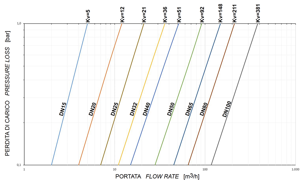 Il valore Kv è il valore di portata in m3/h (con acqua a 15°C) che provoca la caduta di pressione di 1 bar.