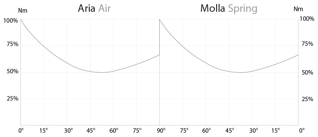 Menor consumo de ar comparado aos atuadores de pinhão e cremalheira (-40% de ar cm³/Nm efeito duplo e -20% de ar cm³/Nm efeito simples) com consequente menor carga de trabalho do compressor ou possibilidade de usar um compressor com dimensões reduzidas