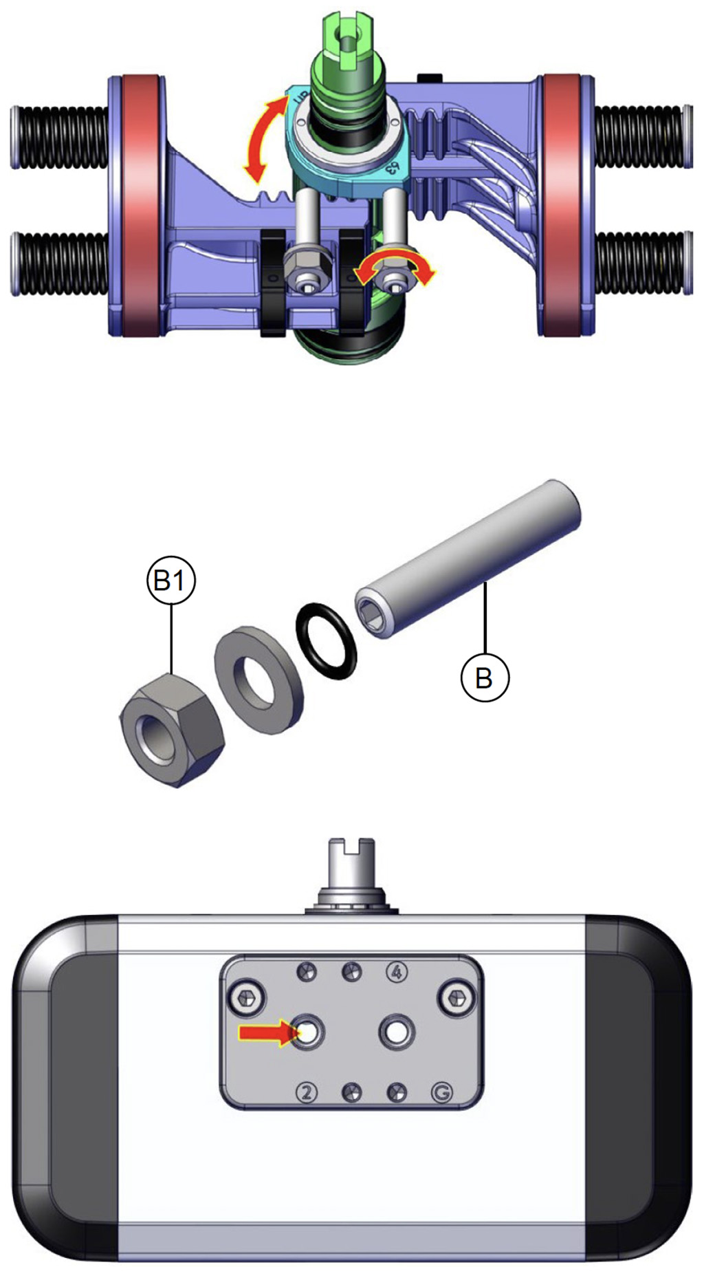 เมื่อไม่มีการจ่ายลม แอคชูเอเตอร์แบบสปริงรีเทิร์นจะกลับสู่ตำแหน่งพัก โดยเพลาจะหมุนตามเข็มนาฬิกา ภาพแสดงตำแหน่งสุดท้ายของเพลา แนะนำให้ติดตั้งตัวกรองขนาดเล็กที่ข้อต่ออากาศหมายเลข 4 เพื่อป้องกันฝุ่นและสิ่งแปลกปลอมเข้าสู่กระบอกสูบ โดยไม่ขัดขวางการไหลของอากาศ