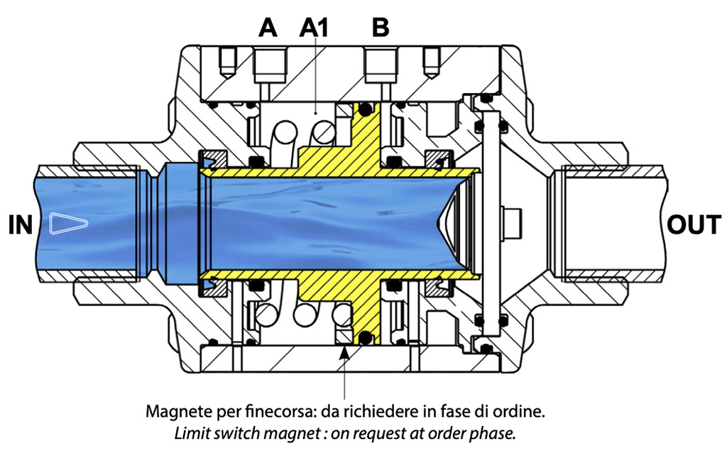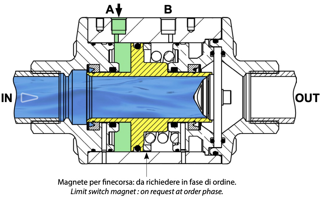 • สามารถตรวจสอบตำแหน่งเปิด/ปิดของวาล์วได้ด้วยสวิตช์ลิมิตแบบเหนี่ยวนำ (คอนแทคแม่เหล็ก) ซึ่งเป็นอุปกรณ์เสริมตามคำขอ โดยต้องระบุแม่เหล็กภายในเมื่อสั่งซื้อ VIP EVO.