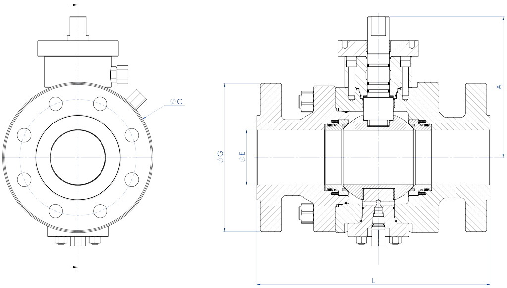 PROJE STANDARTLARI • ASME B16.34 • Uç: ASME B16.5 (RF-RTJ), ASME B16.25 (BW) • Ölçü: ASME B16.10 • Tahrik tertibatı için flanş: ISO5211 • Design API 6D on request.